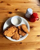 Pieces of breaded chicken strips served with ranch or blue cheese dressing.